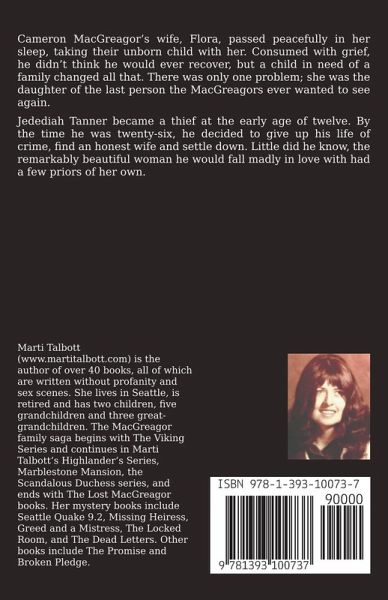 Cameron MacGreagor's wife, Flora, passed peacefully in her sleep, taking their unborn child with her. Consumed with grief, he didn't think he would ever recover, but a child in need of a family changed all that. There was only one problem; she was the daughter of the last person the MacGreagors ever wanted to see again. Jedediah Tanner became a thief at the early age of twelve. By the time he was twenty-six, he decided to give up his life of crime, find an honest wife and settle down. Little did he know, the remarkably beautiful woman he would fall madly in love with had a few priors of her own.