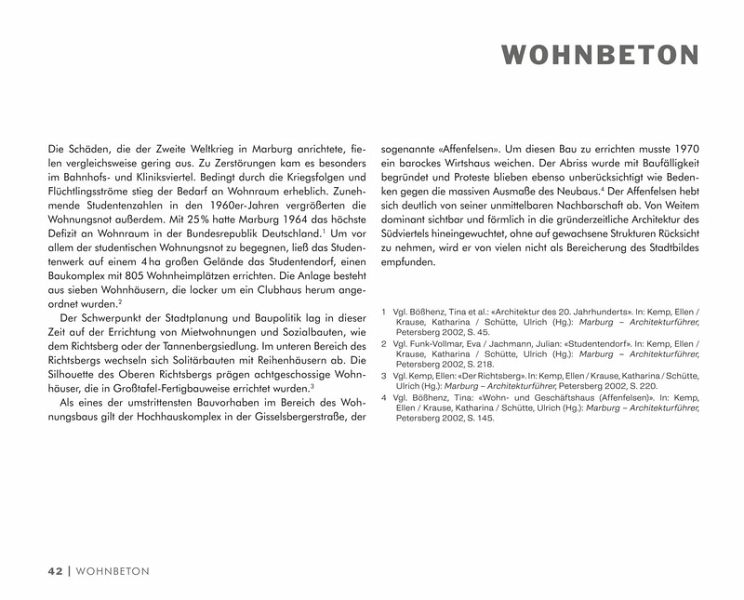 Überall auf der Welt, so auch in Marburg, entstanden in den 1960er und 1970er zahlreiche brutalistische Bauten die heute Mittelpunkt einer kritischen Diskussion um Bedeutung, Wert, Erhaltung und Sanierung sind. Zwar hinterließ der Zweite Weltkrieg in Marburg relativ wenige Schäden, trotzdem ist die Stadtentwicklung von starken Gegensätzen geprägt. In den 1960er war die Verkehrspolitik ein wichtiger Faktor und auch die Anzahl der Studierenden nahm immer mehr zu. Der Schwerpunkt der Baupolitik und Stadtplanung lag auf dem Ausbau des Straßennetzes und der Schaffung von günstigem Wohnraum. Viele der damals errichteten modernen Gebäude prägen heute das Stadtbild.Neben noch immer überwiegend unbeliebten Betonklötzen wie beispielsweise dem sogenannten "Affenfelsen" oder brutalistischen Höhepunkten, wie das Hauptpostamt und die Lahnberge, gibt es eine Reihe Marburger Betongebäude, die weitaus weniger Aufmerksamkeit erfahren, aber dennoch einen Blick wert sind. In diesem Sinne kann dieserBildband auch als Inspiration dienen beim nächsten Spaziergang dem Beton in der Nachbarschaft ein klein wenig mehr Aufmerksamkeit zu schenken.