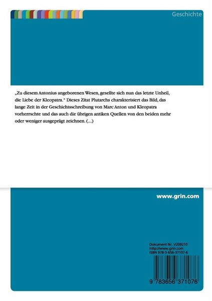 Studienarbeit aus dem Jahr 2013 im Fachbereich Geschichte - Weltgeschichte - Frühgeschichte, Antike, Note: 1,0, Ludwig-Maximilians-Universität München (Historisches Seminar der LMU Alte Geschichte), Veranstaltung: Vertiefungsseminar: Augustus, Sprache: Deutsch, Abstract: "Zu diesem Antonius angeborenen Wesen, gesellte sich nun das letzte Unheil, die Liebe der Kleopatra." Dieses Zitat Plutarchs charakterisiert das Bild, das lange Zeit in der Geschichtsschreibung von Marc Anton und Kleopatra vorherrschte und das auch die übrigen antiken Quellen von den beiden mehr oder weniger ausgeprägt zeichnen. Kleopatra gilt als Frau zwischen zwei Extremen: zum einen als Herrscherin, die mit allen Mitteln, die ihr als Königin zur Verfügung standen, ihre politischen Ziele durchsetzte, zum anderen als Geliebte zweier großer Römer. Die Beziehung zu Marc Anton ist es, die sie endgültig in die "Mühlen der propagandistischen Auseinandersetzung" zwischen Antonius und Octavian treibt. Marc Anton wiederum geht in die Geschichtsschreibung ein als ein von Kleopatra beherrschter, gegen das traditionelle Römertum eingestellter und von Octavian besiegter Politiker, und keineswegs als ernstzunehmende politische Persönlichkeit. Ziel dieser Arbeit soll es nicht sein, mit den Gerüchten um die schillernde Persönlichkeit Kleopatras und ihres Geliebten Marc Antons aufzuräumen, sondern vielmehr sich den Gründen für die verzerrten Bilder der beiden in der historischen Rezeption zu nähern. Dabei wird man feststellen, dass die Art und Weise wie die beiden von der Nachwelt wahrgenommen werden, den Propagandakampf Octavians widerspiegelt. Man kommt nicht umhin, dem späteren Augustus eine große Schuld an der Tatsache zuzuweisen, dass die beiden als Zerrbilder in die Geschichtsschreibung eingegangen sind, Zerrbilder, mit denen erst die moderne Forschung versucht aufzuräumen und sich den wahren Persönlichkeiten, die sich unter dem Schleier augusteischer Propaganda verstecken, zu nähern.