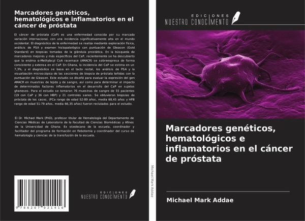 El cáncer de próstata (CaP) es una enfermedad conocida por su marcada variación internacional, con una incidencia significativamente alta en el mundo occidental. El diagnóstico de la enfermedad se realiza mediante exploración física, análisis de PSA y examen histopatológico con puntuación de Gleason (Gold Standard) en biopsias tomadas de la glándula prostática. En la búsqueda de marcadores mejores y más específicos del CaP, recientemente se ha descubierto que la enzima ¿-Methylacyl CoA racemace (AMACR) se sobreexpresa de forma consistente y extensa en el CaP. En Ghana, la incidencia del CaP se estima en un 7,3%, y el diagnóstico se basa en el tacto rectal, los análisis de PSA y la visualización microscópica de las secciones de biopsia de próstata teñidas con la puntuación de Gleason. Este estudio se diseñó para evaluar la expresión del gen AMACR en muestras de tejido y de sangre, así como para determinar el impacto de determinados factores inflamatorios en el desarrollo del CaP en sujetos ghaneses. Para el estudio se tomaron 76 muestras de sangre de 55 pacientes (19 con CaP y 36 con HBP) y 21 controles sanos. Se obtuvieron biopsias de próstata de los casos, (PCa rango de edad 52-89 años, media 68,45 años y HPB rango de edad 51-79 años, media 66,35 años) fueron reclutados para el estudio.