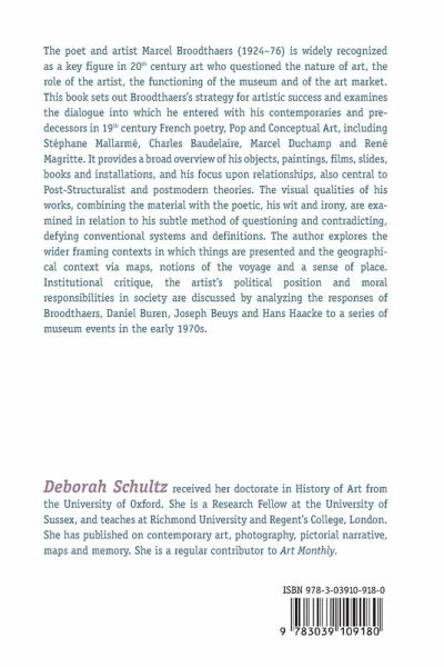 The poet and artist Marcel Broodthaers (1924-76) is widely recognized as a key figure in 20th century art who questioned the nature of art, the role of the artist, the functioning of the museum and of the art market. This book sets out Broodthaers's strategy for artistic success and examines the dialogue into which he entered with his contemporaries and predecessors in 19th century French poetry, Pop and Conceptual Art, including Stéphane Mallarmé, Charles Baudelaire, Marcel Duchamp and René Magritte. It provides a broad overview of his objects, paintings, films, slides, books and installations, and his focus upon relationships, also central to Post-Structuralist and postmodern theories. The visual qualities of his works, combining the material with the poetic, his wit and irony, are examined in relation to his subtle method of questioning and contradicting, defying conventional systems and definitions. The author explores the wider framing contexts in which things are presented and the geographical context via maps, notions of the voyage and a sense of place. Institutional critique, the artist's political position and moral responsibilities in society are discussed by analyzing the responses of Broodthaers, Daniel Buren, Joseph Beuys and Hans Haacke to a series of museum events in the early 1970s.