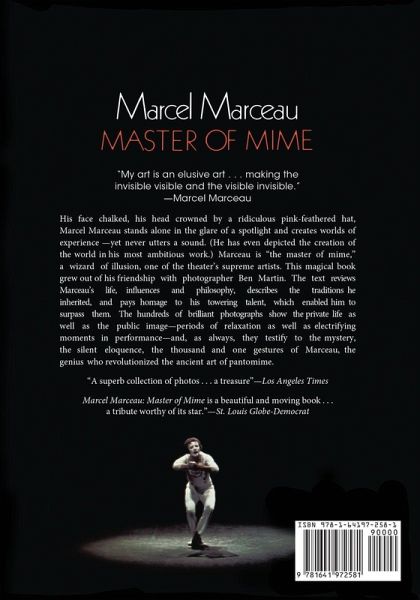 "My art is an elusive art . . . making the invisible visible and the visible invisible."-Marcel Marceau His face chalked, his head crowned by a ridiculous pink-feathered hat, Marcel Marceau stands alone in the glare of a spotlight and creates worlds of experience-yet never utters a sound. (He has even depicted the creation of the world in his most ambitious work.) Marceau is "the master of mime," a wizard of illusion, one of the theater's supreme artists. This magical book grew out of his friendship with photographer Ben martin. The text reviews Marceau's life, influences and philosophy, describes the traditions he inherited, and pays homage to his towering talent, which enabled him to surpass them. The hundreds of brilliant photographs show the private life as well as the public image-periods of relaxation as well as electrifying moments in performance-and, as always, they testify to the mystery, the silent eloquence, the thousand and one gestures of Marceau, the genius who revolutionized the ancient art of pantomime. "A superb collection of photos . . . a treasure"-Los Angeles Times "Marcel Marceau: Master of Mime" is a beautiful and moving book . . . a tribute worthy of its star."-St. Louis Globe-Democrat