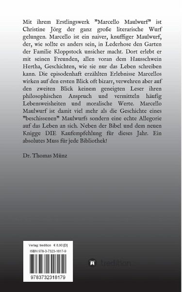 Christine Jörgs Erstlingswerk erzählt die Geschichte eines kleinen Maulwurfs mit einem großen Traum. Begleitet von zahlreichen Weggefährten kämpft Marcello um die Eroberung der Lüfte, erlebt Freud und Leid, überwindet Hindernisse, steht sich selbst im Weg und erlebt einem starken Willen, seiner Tapferkeit, einer gehörigen Portion Größenwahn und wahrlich guten Freunden zum Dank das Abenteuer seines Lebens. Marcello Maulwurf wartet mit tollkühnen Ideen, unerwarteten Wendungen und großen Gefühlen auf.