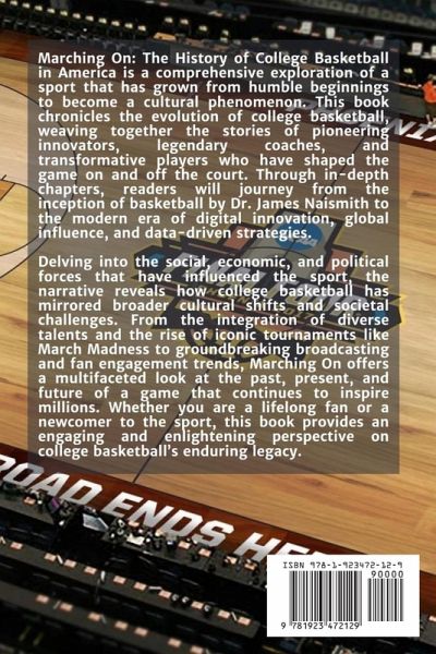 Marching On: The History of College Basketball in America is a comprehensive exploration of a sport that has grown from humble beginnings to become a cultural phenomenon. This book chronicles the evolution of college basketball, weaving together the stories of pioneering innovators, legendary coaches, and transformative players who have shaped the game on and off the court. Through in-depth chapters, readers will journey from the inception of basketball by Dr. James Naismith to the modern era of digital innovation, global influence, and data-driven strategies. Delving into the social, economic, and political forces that have influenced the sport, the narrative reveals how college basketball has mirrored broader cultural shifts and societal challenges. From the integration of diverse talents and the rise of iconic tournaments like March Madness to groundbreaking broadcasting and fan engagement trends, Marching On offers a multifaceted look at the past, present, and future of a game that continues to inspire millions. Whether you are a lifelong fan or a newcomer to the sport, this book provides an engaging and enlightening perspective on college basketball's enduring legacy.