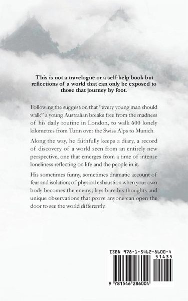This is not a travelogue or a self-help book but reflections of a world that can only be exposed to those that journey by foot Following the suggestion that "every young man should walk" a young Australian breaks free from the madness of his daily routine in London, to walk 600 lonely kilometres from Turin over the Swiss Alps to Munich. Along the way, he faithfully keeps a diary, a record of discovery of a world seen from an entirely new perspective, one that emerges from a time of intense loneliness reflecting on life and the people in it. His sometimes funny, sometimes dramatic account of fear and isolation; of physical exhaustion when your own body becomes the enemy; lays bare his thoughts and unique observations that prove anyone can open the door to see the world differently.