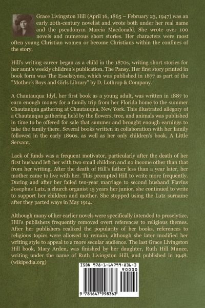 Grace Livingston Hill (April 16, 1865 – February 23, 1947) was an early 20th-century novelist and wrote both under her real name and the pseudonym Marcia Macdonald. She wrote over 100 novels and numerous short stories. Her characters were most often young Christian women or become Christians within the confines of the story. Hill's writing career began as a child in the 1870s, writing short stories for her aunt's weekly children's publication, The Pansy. Her first story printed in book form was The Esselstynes, which was published in 1877 as part of the "Mother's Boys and Girls Library" by D. Lothrop & Company. A Chautauqua Idyl, her first book as a young adult, was written in 1887 to earn enough money for a family trip from her Florida home to the summer Chautauqua gathering at Chautauqua, New York. This illustrated allegory of a Chautauqua gathering held by the flowers, tree, and animals was published in time to be offered for sale that summer and brought enough earnings to take the family there. Several books written in collaboration with her family followed in the early 1890s, as well as her only children's book, A Little Servant. Lack of funds was a frequent motivator, particularly after the death of her first husband left her with two small children and no income other than that from her writing. After the death of Hill's father less than a year later, her mother came to live with her. This prompted Hill to write more frequently. During and after her failed ten-year marriage to second husband Flavius Josephus Lutz, a church organist 15 years her junior, she continued to write to support her children and mother. She stopped using the Lutz surname after they parted ways in May 1914. Although many of her earlier novels were specifically intended to proselytize, Hill's publishers frequently removed overt references to religious themes. After her publishers realized the popularity of her books, references to religious topics were allowed to remain, although she later modified her writing style to appeal to a more secular audience. The last Grace Livingston Hill book, Mary Arden, was finished by her daughter, Ruth Hill Munce, writing under the name of Ruth Livingston Hill, and published in 1948. (wikipedia.org)
