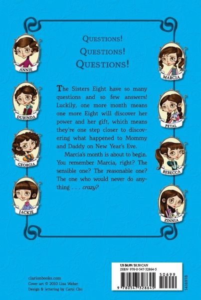 ?The Sisters Eight is really suspenseful and funny.? ?Indrani, age 10 ?I love the Sisters Eight series because I love mysteries. My cousins and friends and my sister and I like to play the Sisters Eight, and we are each a different sister.? ?Claire, age 8 ?I like it!? ?Ian, age 5 Questions! Questions! Questions! The Sisters Eight have so many questions and so few answers! Luckily, one more month means they'll get a few answers. Marcia's month is about to begin. You remember Marcia, right? The sensible one? The one who would never do anything . . . crazy?