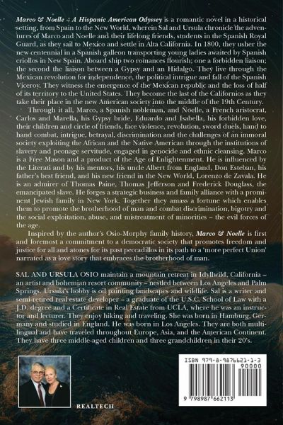 Marco & Noelle - A Hispanic American Odyssey is a romantic novel in a historical setting, from Spain to the New World, wherein Sal and Ursula chronicle the adventures of Marco and Noelle and their lifelong friends, students in the Spanish Royal Guard, as they sail to Mexico and settle in Alta California. In 1800, they usher the new centennial in a Spanish galleon transporting young ladies awaited by Spanish criollos in New Spain. Aboard ship two romances flourish; one a forbidden liaison; the second the liaison between a Gypsy and an Hidalgo. They live through the Mexican revolution for independence, the political intrigue and fall of the Spanish Viceroy. They witness the emergence of the Mexican republic and the loss of half of its territory to the United States. They become the last of the Californios as they take their place in the new American society into the middle of the 19th Century. Through it all, Marco, a Spanish nobleman, and Noelle, a French aristocrat, Carlos and Marella, his Gypsy bride, Eduardo and Isabella, his forbidden love, their children and circle of friends, face violence, revolution, sword duels, hand to hand combat, intrigue, betrayal, discrimination and the challenges of an immoral society exploiting the African and the Native American through the institutions of slavery and peonage servitude, engaged in genocide and ethnic cleansing. Marco is a Free Mason and a product of the Age of Enlightenment. He is influenced by the Literati and by his mentors, his uncle Albert from England, Don Esteban, his father's best friend, and his new friend in the New World, Lorenzo de Zavala. He is an admirer of Thomas Paine, Thomas Jefferson and Frederick Douglass, the emancipated slave. He forges a strategic business and family alliance with a prominent Jewish family in New York. Together they amass a fortune which enables them to promote the brotherhood of man and combat discrimination, bigotry and the social exploitation, abuse, and mistreatment of minorities - the evil forces of the age. Inspired by the author's Osio-Morphy family history, Marco & Noelle is first and foremost a commitment to a democratic society that promotes freedom and justice for all and atones for its past peccadillos in its path to a 'more perfect Union' narrated as a love story that embraces the brotherhood of man.