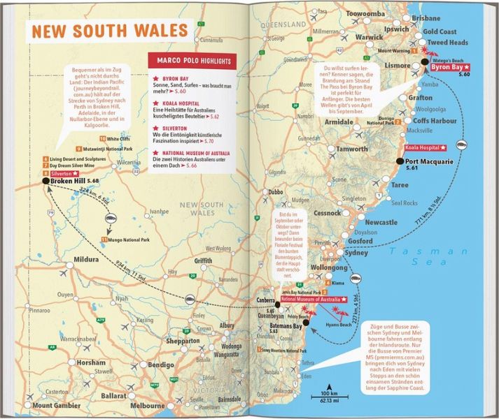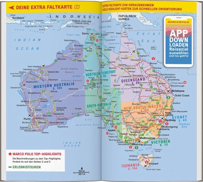 Unterwegs auf dem roten Kontinent mit dem MARCO POLO Reiseführer Australien Wenn du dich nach Weite sehnst, komm nach Australien! Hier ist alles etwas größer, weiter, anders: die Erde ist rot, das Gefieder der Schwäne schwarz und im Winter herrscht Sommer.
