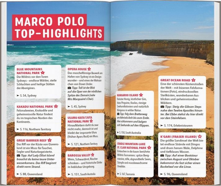 Besuche mit einem Aborigine die Krokodile im Kakadu National Park, schieße die besten Fotos entlang der Great Ocean Road oder erklettere mutig den Bogen der Sydney Harbour Bridge. Dein MARCO POLO Reiseführer begleitet dich zu jedem Abenteuer und gibt dir die besten Tipps rund um deinen Traumurlaub.