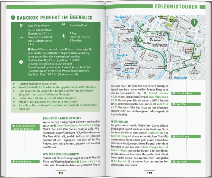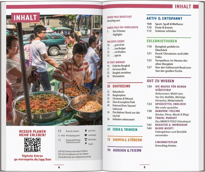 Urlaub zwischen Tradition und Moderne: Mit dem MARCO POLO Reiseführer Bangkok entdecken Eine Megacity zwischen Himmel und Erde, Gestern und Heute: Während oben der Skytrain Touristen und Einheimische in Rekordzeit transportiert, paddeln unten Gemüseverkäuferinnen in Holzbooten über alte Kanäle. Im 60. Stock kredenzen Sterneköche Gourmetgerichte in hochmodernen Rooftop-Restaurants, auf der Straße brutzeln in traditionellen Garküchen Fleischspieße über Holzkohlefeuern.