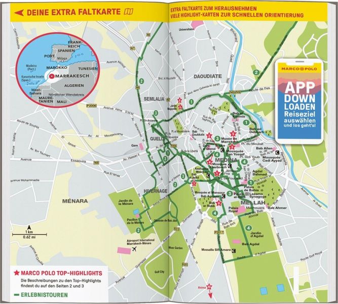 Urlaub wie in Tausendundeiner Nacht mit dem MARCO POLO Reiseführer Marrakesch Europäisch, orientalisch oder afrikanisch? In Marrakesch musst du dich nicht entscheiden! Flaniere zwischen Schlangenbeschwörern am Djemaa al Fna, bestaune die prunkvollen Paläste der Altstadt oder feilsche auf den Souks um Kamelfleisch und Designerkaftane. Mit dem MARCO POLO Reiseführer Marrakesch verpasst du kein Highlight dieser faszinierenden Stadt!
