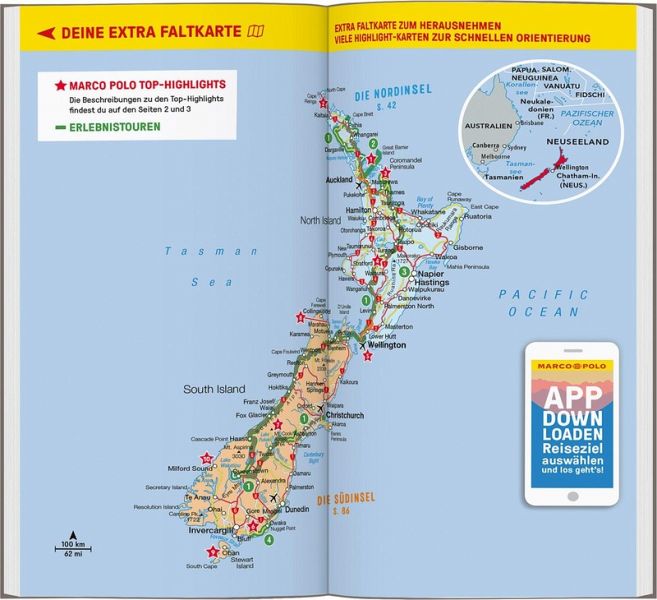 Karten für beste Orientierung: Mit den Highlight-Karten und Stadtplänen bist du vor Ort maximal einfach und schnell informiert Insider-Tipps für das perfekte Neuseeland-Feeling: Ob Kiwis, Sandalen oder BBQ - entdecke mit unseren Autoren, was Einheimische an deinem Reiseziel lieben Shoppen, ausgehen, Restaurants: die beste Kiwi-Fashion, die schönsten Ausgeh-Locations und kulinarische Highlights von Eggs Benedict bis zum Wein Low-Budget, Familien, schlechtes Wetter: Extra-Tipps für verregnete Tage, Abenteuer für Groß und Klein oder den schmalen Geldbeutel Nur das Beste mit der App: Perfekt organisiert vor, während und nach dem Urlaub mit der kostenlosen MARCO POLO Touren-App (mit Online- und Offlinekarten)