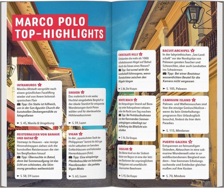 Vielfältige Philippinen: Bestaune den Sonnenaufgang von den Reisterrassen von Banuae aus, erlebe abenteuerliche Höhlenexkursionen in Sagada oder lass die Seele am White Beach auf Boracay baumeln: Plane deinen Traumurlaub mit dem MARCO POLO Reiseführer ganz nach deinen Vorstellungen und lass dir nichts entgehen. Zwischen weißem Sand und trubeligen Party-Locations wartet eine wunderschöne Zeit auf dich.