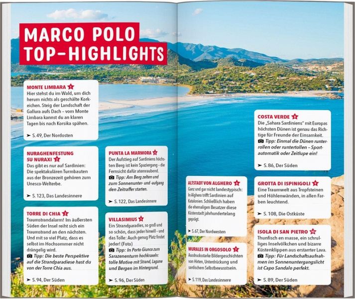 Ob ein Ausflug zu den weißen Eseln auf der ehemaligen Gefängnisinsel Asinara oder ein Nachmittag in der Museumszitadelle in Cagliari: Für deinen Sardinien-Urlaub ist der MARCO POLO Reiseführer der perfekte Begleiter. Darin findest du alles, was du für deine Reise brauchst: von Tipps zu Anreise und Unterbringung bis zum Eventkalender rund ums Jahr.
