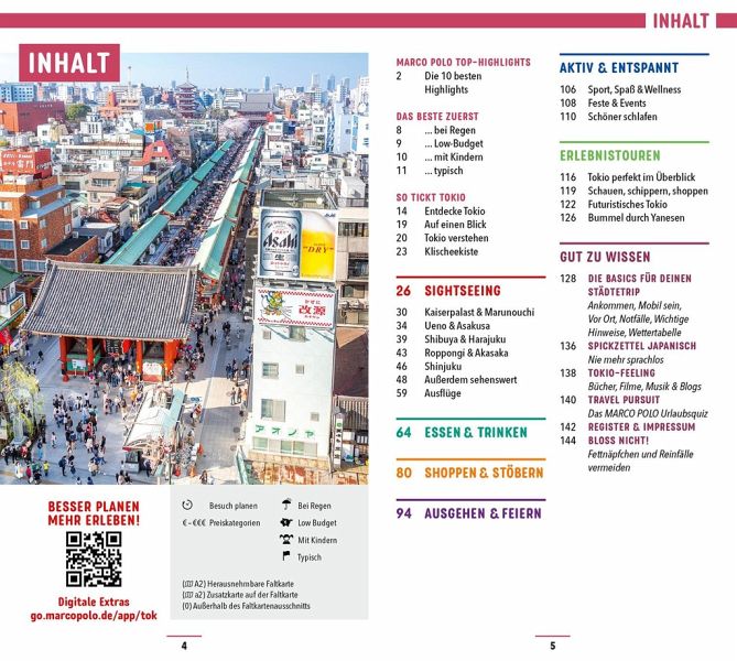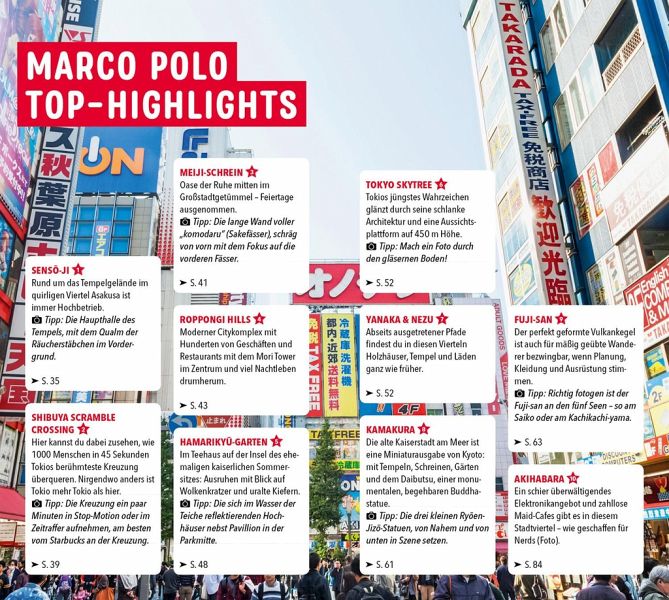 MARCO POLO Insider-Tipps von denen, die Tokio am besten kennen: Entdecke, was die Einheimischen an ihrer Stadt lieben Stadtrundgänge und Ausflüge für jeden Geschmack: Erkunde die japanische Hauptstadt mit den MARCO POLO Erlebnistouren und der kostenlosen Touren-App Shoppingtag oder Partynacht? Hier findest du die besten Restaurants, Shops und Karaokebars für jeden Geschmack und jeden Geldbeutel! Ungetrübte Urlaubsfreude mit den Best-of-Tipps für Regentage, Urlaub mit Kindern und Low-Budget-Ausflüge Mit komplett überarbeiteten Highlight-Karten, Stadtplänen und praktischem Metroplan