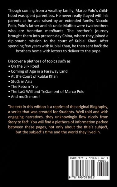 Though coming from a wealthy family, Marco Polo's childhood was spent parentless. He never really stayed with his parents as he was raised by an extended family. Niccolo Polo, Polo's father and his uncle Maffeo were two brothers who are Venetian merchants. The brother's journey brought them into present-day China, where they joined a diplomatic mission to the court of Kublai Khan. After spending few years with Kublai Khan, he then sent back the brothers home with letters to deliver to the pope. Discover a plethora of topics such asOn the Silk Road Coming of Age in a Faraway Land At the Court of Kublai Khan Stuck in Asia The Return Trip The Last Will and Testament of Marco Polo And much more! The text in this edition is a reprint of the original Biography, a series that was created for students. Well told and with engaging narratives, they unknowingly flow nicely from story to fact. You will find a plethora of information packed between these pages, not only about the title's subject, but the subject's time and the world they lived in.
