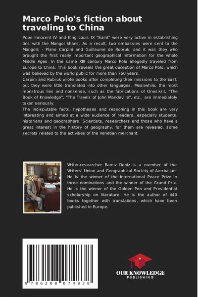 Pope Innocent IV and King Louis IX "Saint" were very active in establishing ties with the Mongol khans. As a result, two embassies were sent to the Mongols - Plano Carpini and Guillaume de Rubruk, and it was they who brought the first really important geographical information for the whole Middle Ages. In the same XIII century Marco Polo allegedly traveled from Europe to China. This book reveals the great deception of Marco Polo, which was believed by the world public for more than 750 years.Carpini and Rubruk wrote books after completing their missions to the East, but they were little translated into other languages. Meanwhile, the most monstrous lies and nonsense, such as the fabrications of Onesikrit, "The Book of Knowledge", "The Travels of John Mandeville", etc., are immediately taken seriously.The indisputable facts, hypotheses and reasoning in this book are very interesting and aimed at a wide audience of readers, especially students, historians and geographers. Scientists, researchers and those who have a great interest in the history of geography, for them are revealed, some secrets related to the activities of the Venetian merchant.