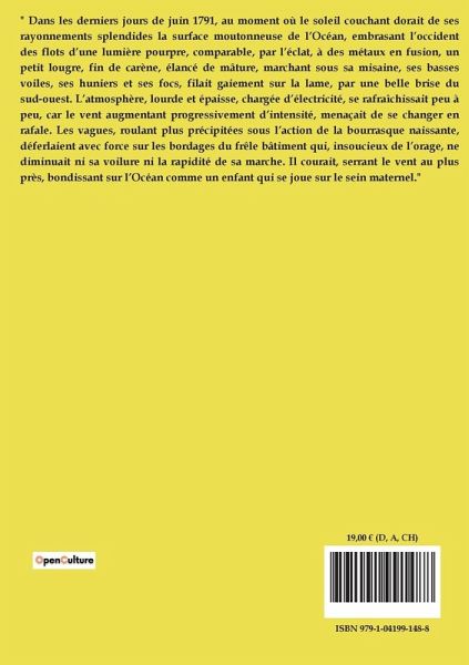 " Dans les derniers jours de juin 1791, au moment où le soleil couchant dorait de ses rayonnements splendides la surface moutonneuse de l¿Océan, embrasant l¿occident des flots d¿une lumière pourpre, comparable, par l¿éclat, à des métaux en fusion, un petit lougre, fin de carène, élancé de mâture, marchant sous sa misaine, ses basses voiles, ses huniers et ses focs, filait gaiement sur la lame, par une belle brise du sudouest. L¿atmosphère, lourde et épaisse, chargée d¿électricité, se rafraîchissait peu à peu, car le vent augmentant progressivement d¿intensité, menaçait de se changer en rafale. Les vagues, roulant plus précipitées sous l¿action de la bourrasque naissante, déferlaient avec force sur les bordages du frêle bâtiment qui, insoucieux de l¿orage, ne diminuait ni sa voilure ni la rapidité de sa marche. Il courait, serrant le vent au plus près, bondissant sur l¿Océan comme un enfant qui se joue sur le sein maternel."