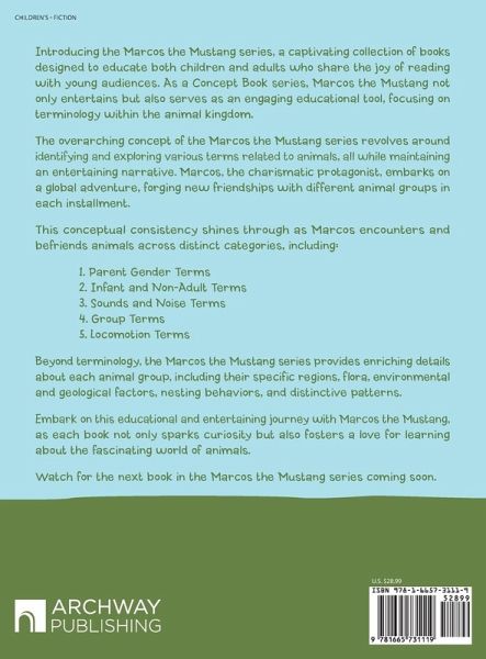 Introducing the Marcos the Mustang series, a captivating collection of books designed to educate both children and adults who share the joy of reading with young audiences. As a Concept Book series, Marcos the Mustang not only entertains but also serves as an engaging educational tool, focusing on terminology within the animal kingdom. The overarching concept of the Marcos the Mustang series revolves around identifying and exploring various terms related to animals, all while maintaining an entertaining narrative. Marcos, the charismatic protagonist, embarks on a global adventure, forging new friendships with different animal groups in each installment. This conceptual consistency shines through as Marcos encounters and befriends animals across distinct categories, including: 1. Parent Gender Terms 2. Infant and Non-Adult Terms 3. Sounds and Noise Terms 4. Group Terms 5. Locomotion Terms Beyond terminology, the Marcos the Mustang series provides enriching details about each animal group, including their specific regions, flora, environmental and geological factors, nesting behaviors, and distinctive patterns. Embark on this educational and entertaining journey with Marcos the Mustang, as each book not only sparks curiosity but also fosters a love for learning about the fascinating world of animals.