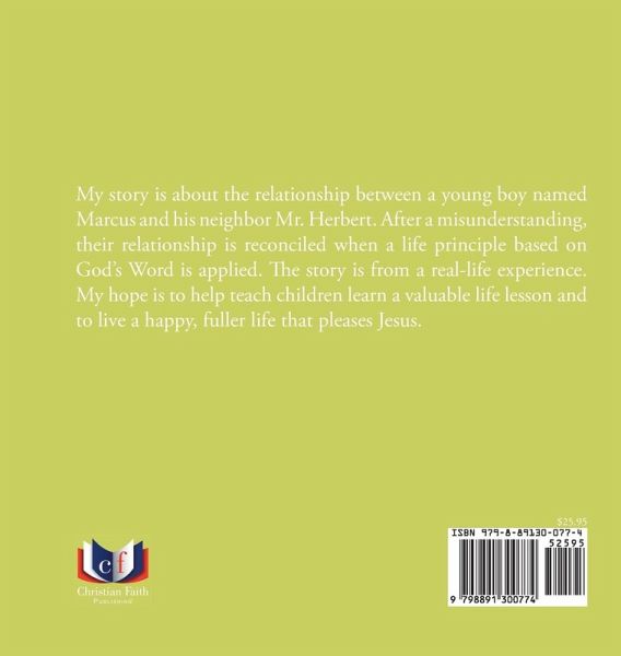 My story is about the relationship between a young boy named Marcus and his neighbor Mr. Herbert. After a misunderstanding, their relationship is reconciled when a life principle based on God's Word is applied. The story is from a real-life experience. My hope is to help teach children learn a valuable life lesson and to live a happy, fuller life that pleases Jesus.