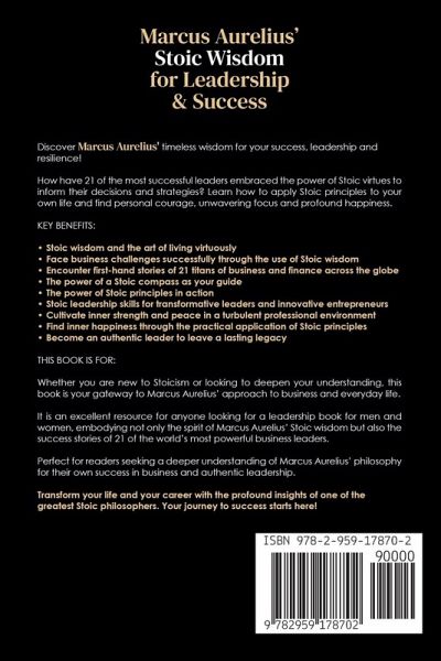 Discover Marcus Aurelius' timeless wisdom for your success, leadership and resilience! How have 21 of the most successful leaders embraced the power of Stoic virtues to inform their decisions and strategies? Learn how to apply Stoic principles to your own life and find personal courage, unwavering focus and profound happiness. Key benefits: · Stoic wisdom and the art of living virtuously · Face business challenges successfully through the use of Stoic wisdom · Encounter first-hand stories of 21 titans of business and finance across the globe · The power of a Stoic compass as your guide · The power of Stoic principles in action · Stoic leadership skills for transformative leaders and innovative entrepreneurs · Cultivate inner strength and peace in a turbulent professional environment · Find inner happiness through the practical application of Stoic principles · Become an authentic leader to leave a lasting legacy This book is for: Whether you are new to Stoicism or looking to deepen your understanding, this book is your gateway to Marcus Aurelius' approach to business and everyday life. It is an excellent resource for anyone looking for a leadership book for men and women, embodying not only the spirit of Marcus Aurelius' Stoic wisdom but also the success stories of 21 of the world's most powerful business leaders. Perfect for readers seeking a deeper understanding of Marcus Aurelius' philosophy for their own success in business and authentic leadership. Transform your life and your career with the profound insights of one of the greatest Stoic philosophers. Your journey to success starts here!