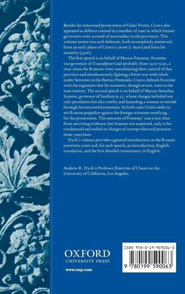 Besides his renowned prosecution of Gaius Verres, Cicero also appeared as defence counsel in a number of cases in which former governors were accused of misconduct in the provinces. This volume unites two such defences, both incompletely preserved, from an early phase of Cicero's career (ca. 69 BC) and from his maturity (54 BC). The first speech is on behalf of Marcus Fonteius. Fonteius was governor of Transalpine Gaul probably from 74 to 72 BC, a time when the Romans were consolidating their control of that province and simultaneously fighting a bitter war with rebels under Sertorius in the Iberian Peninsula. Cicero defends Fonteius with the argument that his measures, though severe, were in the state interest. The second speech is on behalf of Marcus Aemilius Scaurus, governor of Sardinia in 55, whose charges included not only peculation but also cruelty and hounding a woman to suicide through his unwanted attentions. In both cases Cicero seeks to stir Roman prejudice against the foreign witnesses testifying for the prosecution. The outcome of Fonteius' case is not clear from surviving evidence, but Scaurus was acquitted, only to be condemned and exiled on charges of corrupt electoral practices three years later. Dyck's volume provides a general introduction on the Roman extortion court and, for each speech, an introduction, English translation, and the first detailed commentary in English.