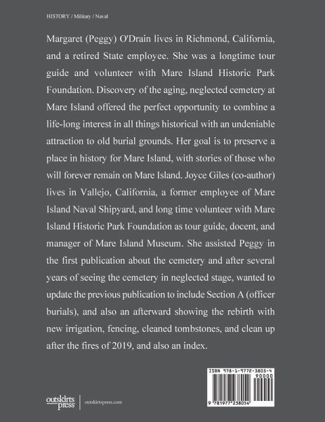 Margaret (Peggy) O'Drain lives in Richmond, California, and a retired State employee. She was a longtime tour guide and volunteer with Mare Island Historic Park Foundation. Discovery of the aging, neglected cemetery at Mare Island offered the perfect opportunity to combine a life-long interest in all things historical with an undeniable attraction to old burial grounds. Her goal is to preserve a place in history for Mare Island, with stories of those who will forever remain on Mare Island. Joyce Giles (co-author) lives in Vallejo, California, a former employee of Mare Island Naval Shipyard, and long time volunteer with Mare Island Historic Park Foundation as tour guide, docent, and manager of Mare Island Museum. She assisted Peggy in the first publication about the cemetery and after several years of seeing the cemetery in neglected stage, wanted to update the previous publication to include Section A (officer burials), and also an afterward showing the rebirth with new irrigation, fencing, cleaned tombstones, and clean up after the fires of 2019, and also an index.