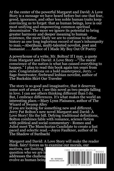 "Margaret and David: A Love Story," is a circumspect story which takes its presumption from history; a love story with political ramifications and social impact. After America's second civil war, fanatical Muslims seized power. "Margaret and David: A Love Story" is the story of tragic interracial love which develops as a nation grows to understand that bigotry and suspicion are tools for oppression and hate no matter where it is found. This is a love story of hope and devotion in the face of hopelessness and despair; a story which blur the lines of our multi-racial society. "Margaret and David: A Love Story" is about forbidden passion, political upheaval, treachery and hate.