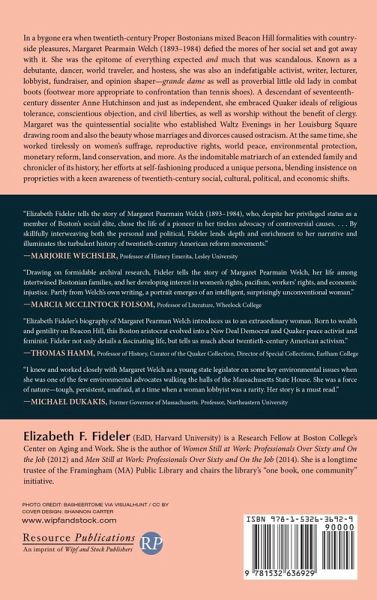 In a bygone era when twentieth-century Proper Bostonians mixed Beacon Hill formalities with countryside pleasures, Margaret Pearmain Welch (1893-1984) defied the mores of her social set and got away with it. She was the epitome of everything expected and much that was scandalous. Known as a debutante, dancer, world traveler, and hostess, she was also an indefatigable activist, writer, lecturer, lobbyist, fundraiser, and opinion shaper--grande dame as well as proverbial little old lady in combat boots (footwear more appropriate to confrontation than tennis shoes). A descendant of seventeenth-century dissenter Anne Hutchinson and just as independent, she embraced Quaker ideals of religious tolerance, conscientious objection, and civil liberties, as well as worship without the benefit of clergy. Margaret was the quintessential socialite who established Waltz Evenings in her Louisburg Square drawing room and also the beauty whose marriages and divorces caused ostracism. At the same time, she worked tirelessly on women's suffrage, reproductive rights, world peace, environmental protection, monetary reform, land conservation, and more. As the indomitable matriarch of an extended family and chronicler of its history, her efforts at self-fashioning produced a unique persona, blending insistence on proprieties with a keen awareness of twentieth-century social, cultural, political, and economic shifts.