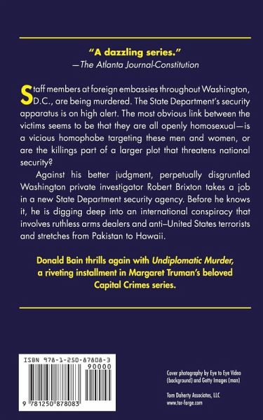 Private investigator Robert Brixton has always hated Washington. Against his better judgment, he decides to stick around and take a job as an agent in a new State Department security agency headed by his former boss at the Washington P.D. After work one day he meets his youngest daughter, Janet, for a drink at an outdoor cafe. Shockingly, a young Arabic woman blows herself up, killing Janet and a dozen others. Seeking revenge for his daughter, Brixton follows the tracks of the bomber to a powerful senator's son. Brixton finds himself digging deep into what turns out to be a small but powerful cabal whose goal is to kill embassy workers from nations involved in the invasion of Iraq and Afghanistan. Donald Bain thrills again with Margaret Truman's Undiplomatic Murder, the riveting next installment in the Margaret Truman's beloved Capital Crimes series.