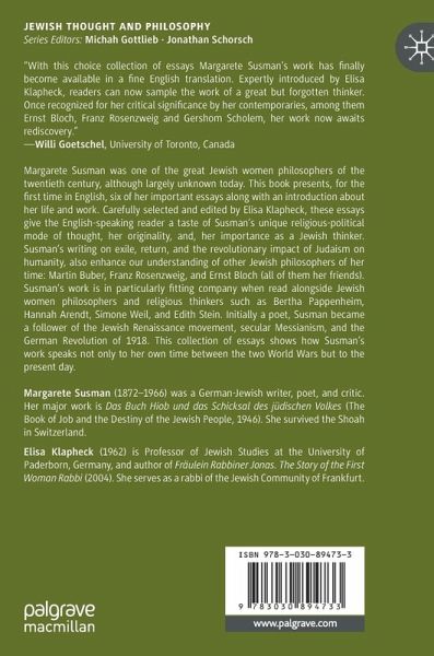 Margarete Susman was among the great Jewish women philosophers of the twentieth century, and largely unknown to many today. This book presents, for the first time in English, six of her important essays along with an introduction about her life and work. Carefully selected and edited by Elisa Klapheck, these essays give the English-speaking reader a taste of Susman's religious-political mode of thought, her originality, and her importance as Jewish thinker. Susman's writing on exile, return, and the revolutionary impact of Judaism on humanity, illuminate enhance our understanding of other Jewish philosophers of her time: Martin Buber, Franz Rosenzweig, and Ernst Bloch (all of them her friends). Her work is in particularly fitting company when read alongside Jewish religious-political and political thinkers such as Bertha Pappenheim, Hannah Arendt, Simone Weil, and Gertrud Stein. Initially a poet, Susman became a follower of the Jewish Renaissance movement, secular Messianism,and the German Revolution of 1918. This collection of essays shows how Susman's work speaks not only to her own time between the two World Wars but to the present day.