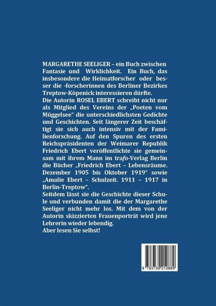 MARGARETHE SEELIGER EIN FRAUENPORTRÄTVor 120 Jahren legte eine Frau, von Beruf Lehrerin, den Grundstein für die höhere Schulbildung der Mädchen in Treptow-Baumschulenweg. Es war ein steiniger Weg, den sie gehen musste, bevor sie in diesem Ortsteil als Vorsteherin einer Privatschule Fuß fassen konnte. Diese Frau wurde für ihr Engagement und ihre Leistung gelobt und geehrt, solange, bis sich die Gemeindevertreter auf der Grundlage der Preußischen Mädchenschulreform von 1908 dazu entschlossen, mit einem bombastischen Schulneubau in Baumschulenweg den Grundstein für eine Mädchenschule von gymnasialem Charakter zu legen. Die Einweihung dieser Schule erfolgte im Jahr 1913 und für die Lehrerin war nichts mehr so wie zuvor.Denn nicht ihr, der bisherigen Schulvorsteherin, übertrug man die Leitung. Nein. Der zukünftige Direktor war ein MANN! Noch einmal zum Verständnis: Es geht um keine Knabenschule. Auch nicht um eine, wo Kinder beider Geschlechter lernen. Es geht um nicht mehr und nicht weniger als um eine ÖFFENTLICHE HÖHERE MÄDCHENSCHULE. Aber die konnte oder durfte keine Frau leiten.Für die Autorin ist diese Entscheidung mehr als demütigend, doch sie entspricht den Gepflogenheiten jener Zeit. Ihr Inneres schreit nach Gerechtigkeit. Wenigstens im Nachhinein möchte sie dieser Frau, deren Schicksal sie schon seit längerem beschäftigt, in Wort und Bild ein Denkmal setzen. Dabei hat sie mit akribischen Recherchen und Fantasie ihr Möglichstes getan.