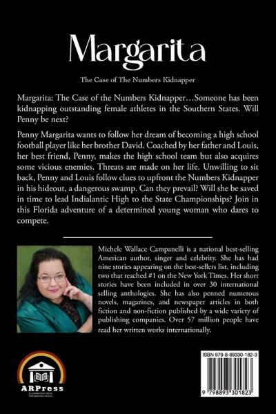 Margarita: The Case of the Numbers Kidnapper...Someone has been kidnapping outstanding female athletes in the Southern States. Will Penny be next? Penny Margarita wants to follow her dream of becoming a high school football player like her brother David. Coached by her father and Louis, her best friend, Penny, makes the high school team but also acquires some vicious enemies. Threats are made on her life. Unwilling to sit back, Penny and Louis follow clues to upfront the Numbers Kidnapper in his hideout, a dangerous swamp. Can they prevail? Will she be saved in time to lead Indialantic High to the State Championships? Join in this Florida adventure of a determined young woman who dares to compete.