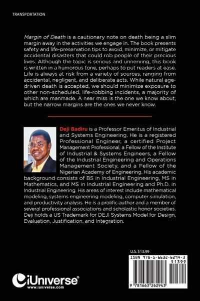 Margin of Death is a cautionary note on death being a slim margin away in the activities we engage in. The book presents safety and life-preservation tips to avoid, minimize, or mitigate accidental disasters that could rob people of their precious lives. Although the topic is serious and unnerving, this book is written in a humorous tone, perhaps to put readers at ease. Life is always at risk from a variety of sources, ranging from accidental, negligent, and deliberate acts. While natural age-driven death is accepted, we should minimize exposure to other non-scheduled, life-robbing incidents, a majority of which are manmade. A near miss is the one we know about, but the narrow margins are the ones we never know.