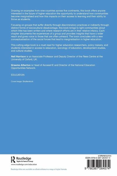 Drawing on examples from nine countries across five continents, this book offers anyone interested in the future of higher education the opportunity to understand how communities become marginalised and how this impacts on their access to learning and their ability to thrive as students. Focusing on groups that suffer directly through discriminatory practices or indirectly through distinct forms of sociocultural disadvantage, this book brings to light communities about which little has been written and where research efforts are in their relative infancy. Each chapter documents the experiences of a group and provides insights that have a wider reach and gives voice to those that are often unheard. The book concludes with a new conceptualisation of the social forces that lead to marginalisation in higher education. This cutting-edge book is a must read for higher education researchers, policy makers, and students interested in access to education, sociology of education, development studies, and cultural studies.