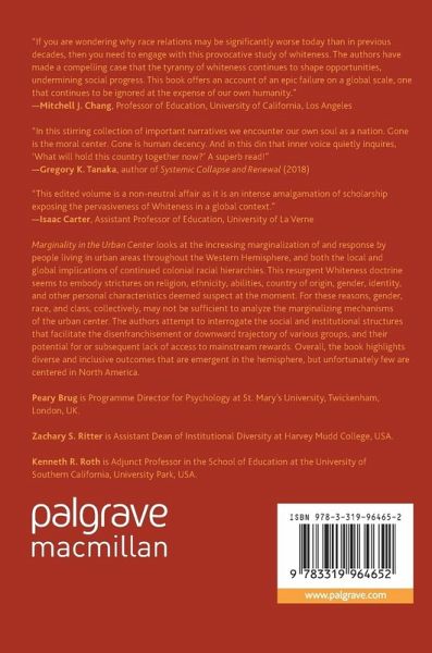 This book examines the increasing marginalization of and response by people living in urban areas throughout the Western Hemisphere, and both the local and global implications of continued colonial racial hierarchies and the often-dire consequences they have for people perceived as different. However, in the aftermath of recent U.S. elections, whiteness also seems to embody strictures on religion, ethnicity, country of origin, and almost any other personal characteristic deemed suspect at the moment. For that reason, gender, race, and even class, collectively, may not be sufficient units of analysis to study the marginalizing mechanisms of the urban center. The authors interrogate the social and institutional structures that facilitate the disenfranchisement or downward trajectory of groups, and their potential or subsequent lack of access to mainstream rewards. The book also seeks to highlight examples where marginalized groups have found ways to assert their equality. No recenttextshave attempted to connect the mechanisms of marginality across geographical and political boundaries within the Western Hemisphere.