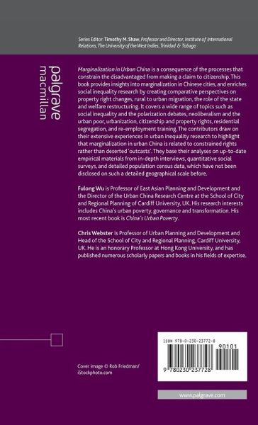 Introduction: China's Urban Marginalization in Comparative Perspectives; F.Wu & C.Webster PART I: CONCEPT AND COMPARATIVE PERSPECTIVES OF MARGINALIZATION Urban Inequality: Its Definition, Measurement, Causes and Importance; C.Hamnett Neoliberalism and the Urban Poor: A View from Latin America; A.Gilbert PART II: PROPERTY RIGHTS AND MARGINALIZATION IN CHINA Entitlement to the Benefits of Urbanisation: Comparing Migrant and Peri-Urban 'Peasants'; C.Webster & Y.Zhao Property Rights, Citizenship and the Making of the New Poor in Urban China; F.Wu The Strength of Property Rights, Prospects for the Disadvantaged, and Constraints on the Actions of the Politically Powerful in Hong Kong and China; A.Smart Empowerment or Marginalization: Land, Housing and Property Rights in Poor Neighbourhoods; H.B.Shin PART III: RURAL-URBAN MIGRATION AND MARGINALIZATION Rural-Urban Migration in China: Scale, Composition, Pattern and Deprivation; A.Hussain & Y.Wang Private Rental Housing in 'Urban Villages' in Shenzhen: Problems or Solutions?; Y.P.Wang, Y.Wang & J. Wu Chinese Urban Villages as Marginalized Neighbourhoods under Rapid Urbanization; Y.Liu & S.He PART IV: DEPRIVATION AND SEGREGATION Multiple Deprivation in Urban China: An Analysis of Individual Survey Data; Y.Yuan & F.Wu Post-Reform Residential Segregation in Three Chinese Cities: Beijing, Shanghai and Guangzhou; Z.Li & F.Wu PART V: STATE ACTION The Urban Dibao: Guarantee for Minimum Livelihood or for Minimal Turmoil?; D.J.Solinger State Funded Reemployment Training and Participation of Informal Employment in Tianjin; B.Li & H.Peng What has been Marginalized? Marginalization as the Constrained 'Right to the City' in Urban China; F.Wu & C.Webster