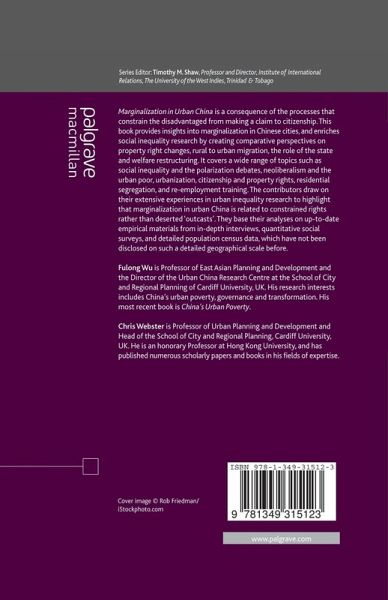 Introduction: China's Urban Marginalization in Comparative Perspectives; F.Wu & C.Webster PART I: CONCEPT AND COMPARATIVE PERSPECTIVES OF MARGINALIZATION Urban Inequality: Its Definition, Measurement, Causes and Importance; C.Hamnett Neoliberalism and the Urban Poor: A View from Latin America; A.Gilbert PART II: PROPERTY RIGHTS AND MARGINALIZATION IN CHINA Entitlement to the Benefits of Urbanisation: Comparing Migrant and Peri-Urban 'Peasants'; C.Webster & Y.Zhao Property Rights, Citizenship and the Making of the New Poor in Urban China; F.Wu The Strength of Property Rights, Prospects for the Disadvantaged, and Constraints on the Actions of the Politically Powerful in Hong Kong and China; A.Smart Empowerment or Marginalization: Land, Housing and Property Rights in Poor Neighbourhoods; H.B.Shin PART III: RURAL-URBAN MIGRATION AND MARGINALIZATION Rural-Urban Migration in China: Scale, Composition, Pattern and Deprivation; A.Hussain & Y.Wang Private Rental Housing in 'Urban Villages' in Shenzhen: Problems or Solutions?; Y.P.Wang, Y.Wang & J. Wu Chinese Urban Villages as Marginalized Neighbourhoods under Rapid Urbanization; Y.Liu & S.He PART IV: DEPRIVATION AND SEGREGATION Multiple Deprivation in Urban China: An Analysis of Individual Survey Data; Y.Yuan & F.Wu Post-Reform Residential Segregation in Three Chinese Cities: Beijing, Shanghai and Guangzhou; Z.Li & F.Wu PART V: STATE ACTION The Urban Dibao: Guarantee for Minimum Livelihood or for Minimal Turmoil?; D.J.Solinger State Funded Reemployment Training and Participation of Informal Employment in Tianjin; B.Li & H.Peng What has been Marginalized? Marginalization as the Constrained 'Right to the City' in Urban China; F.Wu & C.Webster