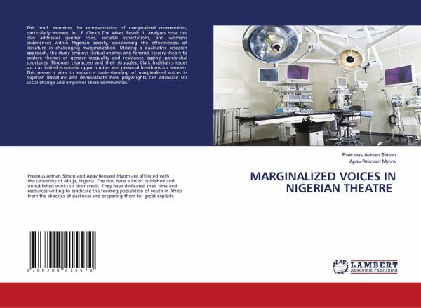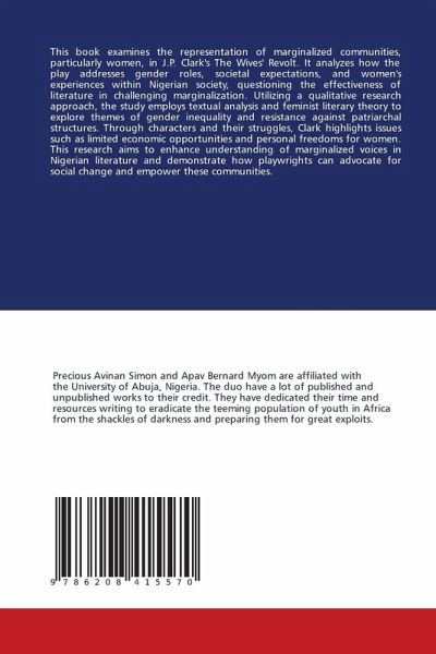 This book examines the representation of marginalized communities, particularly women, in J.P. Clark's The Wives' Revolt. It analyzes how the play addresses gender roles, societal expectations, and women's experiences within Nigerian society, questioning the effectiveness of literature in challenging marginalization. Utilizing a qualitative research approach, the study employs textual analysis and feminist literary theory to explore themes of gender inequality and resistance against patriarchal structures. Through characters and their struggles, Clark highlights issues such as limited economic opportunities and personal freedoms for women. This research aims to enhance understanding of marginalized voices in Nigerian literature and demonstrate how playwrights can advocate for social change and empower these communities.