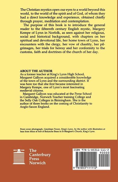 The Christian mystics open our eyes to a world beyond this world, to the world of the spirit and of God, of whom they had a direct knowledge and experience, obtained chiefly through prayer, meditation and contemplation. The purpose of this book is to introduce the general reader to the fifteenth century English mystic, Margery Kempe of Lynn in Norfolk, as seen against her religious, social and historical background, with chapters on her spiritual and devotional life, her home town of Lynn, her encounters with the clergy, her vow of chastity, her pilgrimages, her trials for heresy and her conformity to the customs, faith and doctrines of the church of her day. As a former teacher at King's Lynn High School, Margaret Gallyon acquired a considerable knowledge of the town of Lynn and the surrounding district. It was here too that she first became interested in Margery Kempe, one of Lynn's most fascinating medieval citizens. Margaret Gallyon was educated at the Perse School, Cambridge, Norwich Teacher Training College and the Selly Oak Colleges in Birmingham. She is the author of three books on the coming of Christianity to Anglo-Saxon England.