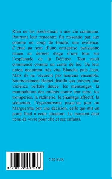 Rien ne les prédestinait à une vie commune. Pourtant leur rencontre fut ressentie par eux comme un coup de foudre, une évidence. C'était au sein d'une entreprise parisienne. Tout avait commencé comme dans un conte de fée. De leur union naquirent très vite Blanche puis Jean. Mais ils ne vécurent pas heureux ensemble. Sournoisement Rafael distilla son univers, une violence verbale douce, les mensonges, la manipulation des enfants contre leur mère, les tromperies, la radinerie, le chantage affectif, la séduction, l'égocentrisme jusqu'au jour où Margueritte prit une décision, celle qui mit un point final à cette situation. Le moment de vivre pour elle et ses enfants était venu.