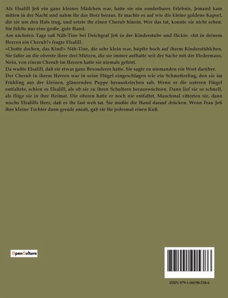 Als Elsalill Jeß ein ganz kleines Mädchen war, hatte sie ein sonderbares Erlebnis. Jemand kam mitten in der Nacht und nahm ihr das Herz heraus. Er machte es auf wie die kleine goldene Kapsel, die sie um den Hals trug, und setzte ihr einen Cherub hinein. Wer das tat, konnte sie nicht sehen. Sie fühlte nur eine große, gute Hand. Am nächsten Tage saß Näh-Tine bei Deichgraf Jeß in der Kinderstube und flickte. »Ist in deinem Herzen ein Cherub?« fragte Elsalill. »Chotte dochen, das Kind!« Näh-Tine, die sehr klein war, hüpfte hoch auf ihrem Kinderstühlchen. Sie faßte an die oberste ihrer drei Mützen, die sie immer aufhatte seit der Sache mit der Fledermaus. Nein, von einem Cherub im Herzen hatte sie niemals gehört. Da wußte Elsalill, daß sie etwas ganz Besonderes hatte. Sie sagte zu niemanden ein Wort darüber. Der Cherub in ihrem Herzen war in seine Flügel eingeschlagen wie ein Schmetterling, den sie im Frühling aus der kleinen, glänzenden Puppe herauskriechen sah. Wenn er die unteren Flügel entfaltete, schien es Elsalill, als ob sie zu ihren Schultern herauswüchsen. Dann lief sie so schnell, als flöge sie in ihre Heimat. Die oberen hatte er noch nie entfaltet. Manchmal zitterten sie, dann wuchs Elsalills Herz, daß es ihr fast weh tat. Sie mußte die Hand darauf drücken. Wenn Frau Jeß ihre kleine Tochter dann gerade ansah, gab sie ihr jedesmal einen Kuß.