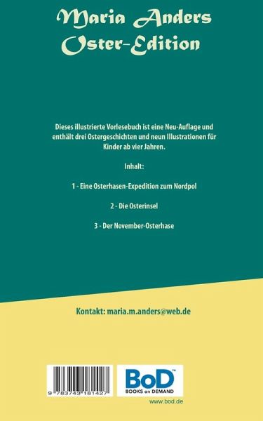 Dieses illustrierte Vorlesebuch ist eine Neu-Auflage und enthält drei Ostergeschichten und neun Illustrationen für Kinder ab vier Jahren. Inhalt: 1 - Eine Osterhasen-Expedition zum Nordpol, 2 - Die Osterinsel, 3 - Der November-Osterhase.
