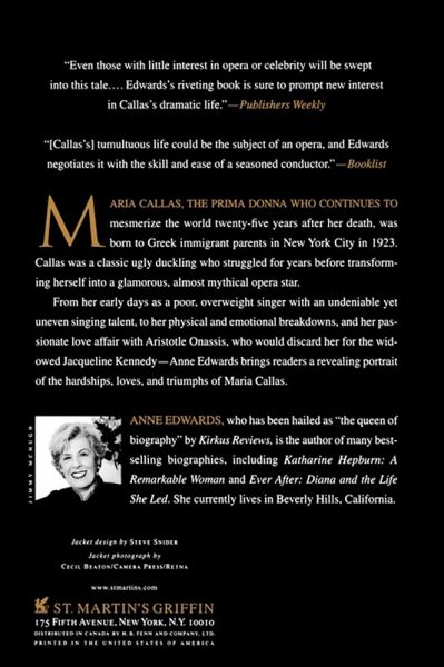 Maria Callas continues to mesmerize us decades after her death, not only because she was indisputably the greatest opera diva of the 20th century, but also because both her life and death were shrouded in a Machiavellian web of scandal, mystery and deception. Now Anne Edwards, well known for her revealing and insightful biographies of some of the world's most noted women, tells the intimate story of Maria Callas-her loves, her life, and her music, revealing the true woman behind the headlines, gossip and speculation. The second daughter of Greek immigrant parents, Maria found herself in the grasp of an overwhelmingly ambitious mother who took her away from her native New York and the father she loved, to a Greece on the eve of the Second World War. From there, we learn of the hardships, loves and triumphs Maria experienced in her professional and personal life. We are introduced to the men who marked Callas forever-Luchino Visconti, the brilliant homosexual director who she loved hopelessly, Giovanni Battista Meneghini, the husband thirty years her senior who used her for his own ambitions, as had her mother, and Aristotle Onassis, who put an end to their historic love affair by discarding her for the widowed Jacqueline Kennedy. Throughout her life, Callas waged a constant battle with her weight, a battle she eventually won, transforming herself from an ugly duckling into the slim and glamorous diva who transformed opera forever, whose recordings are legend, and whose life is the stuff of which tabloids are made. Anne Edwards goes deeper than previous biographies of Maria Callas have dared. She draws upon intensive research to refute the story of Callas's "mystery child" by Onassis, and she reveals the true circumstances of the years preceding Callas's death, including the deception perpetrated by her close and trusted friend. As in her portraits of other brilliant, star-crossed women, Edwards brings Maria Callas-the intimate Callas-alive.