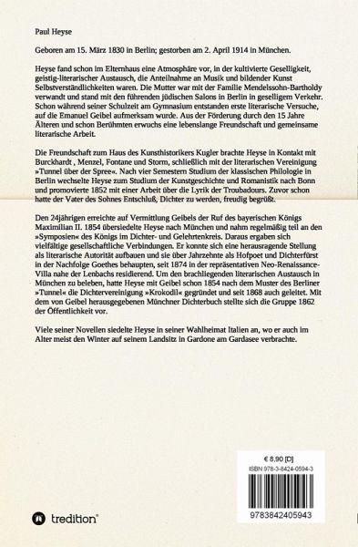 Paul Heyse (1830-1919), der Inbegriff des deutschsprachigen Dichters, war seit seinem 24. Lebensjahr Poeta laureatus am Hof Maximilians II. Mit seinen Novellen erlangte er in den siebziger Jahren des 19. Jahrhunderts große Berühmtheit. Sie wurden insbesondere für ihre 'vornehme Einfachheit', die sie unverkennbar machen, geschätzt. Später geriet er - und mit ihm sein Werk - ins Kreuzfeuer der Kritik. Von den Naturalisten wurde er wegen seiner bislang unangefochtenen Stellung als Vorzeigedichter angefeindet, andere verurteilten seine Novellen als zu unmoralisch. 1910 erhielt Paul Heyse für sein dichterisches Werk den Nobelpreis für Literatur.