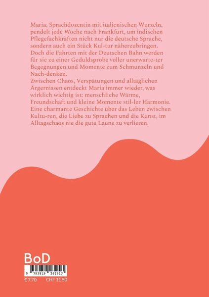Maria, Sprachdozentin mit italienischen Wurzeln, pendelt jede Woche nach Frankfurt, um indischen Pflegefachkräften nicht nur die deutsche Sprache, sondern auch ein Stück Kul-tur näherzubringen. Doch die Fahrten mit der Deutschen Bahn werden für sie zu einer Geduldsprobe voller unerwarte-ter Begegnungen und Momente zum Schmunzeln und Nach-denken. Zwischen Chaos, Verspätungen und alltäglichen Ärgernissen entdeckt Maria immer wieder, was wirklich wichtig ist: menschliche Wärme, Freundschaft und kleine Momente stil-ler Harmonie. Eine charmante Geschichte über das Leben zwischen Kultu-ren, die Liebe zu Sprachen und die Kunst, im Alltagschaos nie die gute Laune zu verlieren.