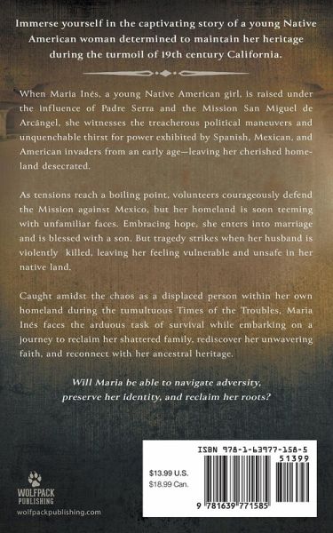 Immerse yourself in the captivating story of a young Native American woman determined to maintain her heritage during the turmoil of 19th century California. When Maria Inés, a young Native American girl, is raised under the influence of Padre Serra and the Mission San Miguel de Arcángel, she witnesses the treacherous political maneuvers and unquenchable thirst for power exhibited by Spanish, Mexican, and American invaders from an early age-leaving her cherished homeland desecrated. As tensions reach a boiling point, volunteers courageously defend the Mission against Mexico, but her homeland is soon teeming with unfamiliar faces. Embracing hope, she enters into marriage and is blessed with a son. But tragedy strikes when her husband is violently killed, leaving her feeling vulnerable and unsafe in her native land. Caught amidst the chaos as a displaced person within her own homeland during the tumultuous Times of the Troubles, Maria Inés faces the arduous task of survival while embarking on a journey to reclaim her shattered family, rediscover her unwavering faith, and reconnect with her ancestral heritage. Will Maria be able to navigate adversity, preserve her identity, and reclaim her roots?