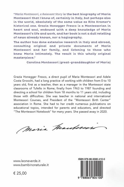 "Maria Montessori, a Relevant Story is the best biography of Maria Montessori that I know of, certainly in Italy, but perhaps also in the world, absolutely of the same value as Rita Kramer's historical one. Grazia Honegger Fresco is a Montessorian in heart and soul, endowed with a deep knowledge of Maria Montessori's life and work, and her book is not a dull retelling of news already known, nor a hagiography. The author has done extensive research in Italy and abroad, consulting original and private documents of Maria Montessori and her family, and listening to those who knew Maria intimately. The result is this wholly original masterpiece." Carolina Montessori (great-granddaughter of Maria)