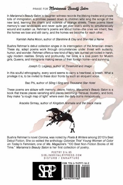 Bushra Rehman's debut collection singes in its interrogation of the American dream while capturing the lives of a neighborhood in transition. These sly, adept poems work through circumstances under threat with audacity, humor, and wonder. Rehman offers a new kind of fairy tale, surreal yet rooted in harsh, ugly modern realities. Simply and profoundly, her book is a love poem for Muslim girls, Queens, and immigrants making sense of their foreign home--and surviving. - Joseph O. Legaspi, author of Threshold and Imago
